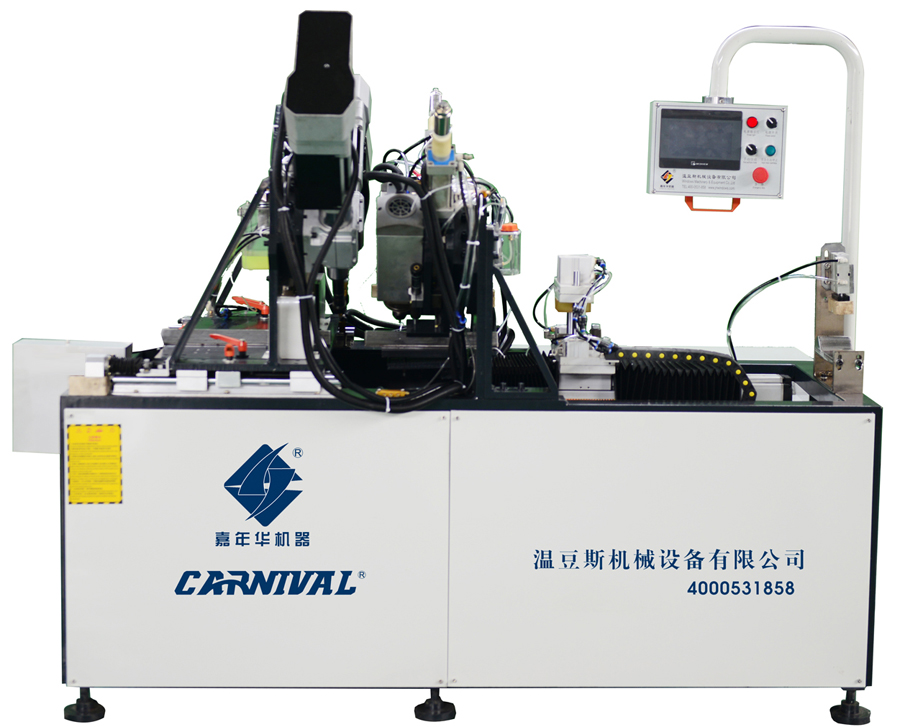 說明:此款機型專門為目前市面上新型的簡易角碼自動加工而設計。簡易角碼也稱為:簡約角碼,系統門窗專用角碼。注膠角碼。此種角碼不同于以往的活動角碼:沒有彈簧鋁帽。取而代之的是兩邊各1-2顆定制的螺絲。簡易角碼具有裝配簡單,造價低,現場施工簡單等特點。此種角碼自動加工要求:自動送料-角碼兩邊鉆孔-角碼兩邊攻絲-切斷。我司適應市場需求創新性使用了電主軸鉆孔-伺服攻絲機攻絲-鋸片切斷來實現多種類型角碼、多種高度角碼的通用機型。機型不需要更換模具即可加工高度在10-35毫米之間任意簡易角碼。該機型一經投放市場取得了良好的認知度,贏得客戶一致好評。